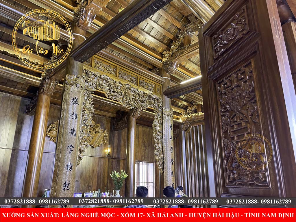 Tại Nhà Gỗ Đại Lâm Mộc, chúng tôi không chỉ thi công nhà gỗ chuẩn cổ truyền mà còn trực tiếp chạm khắc, thiết kế các bộ đồ thờ chuẩn lối Bắc Bộ, chất liệu gỗ quý, hoa văn mang đậm dấu ấn văn hóa Việt.