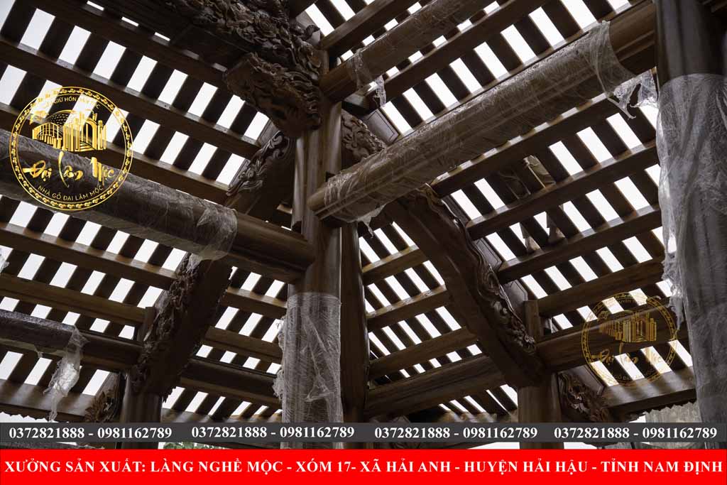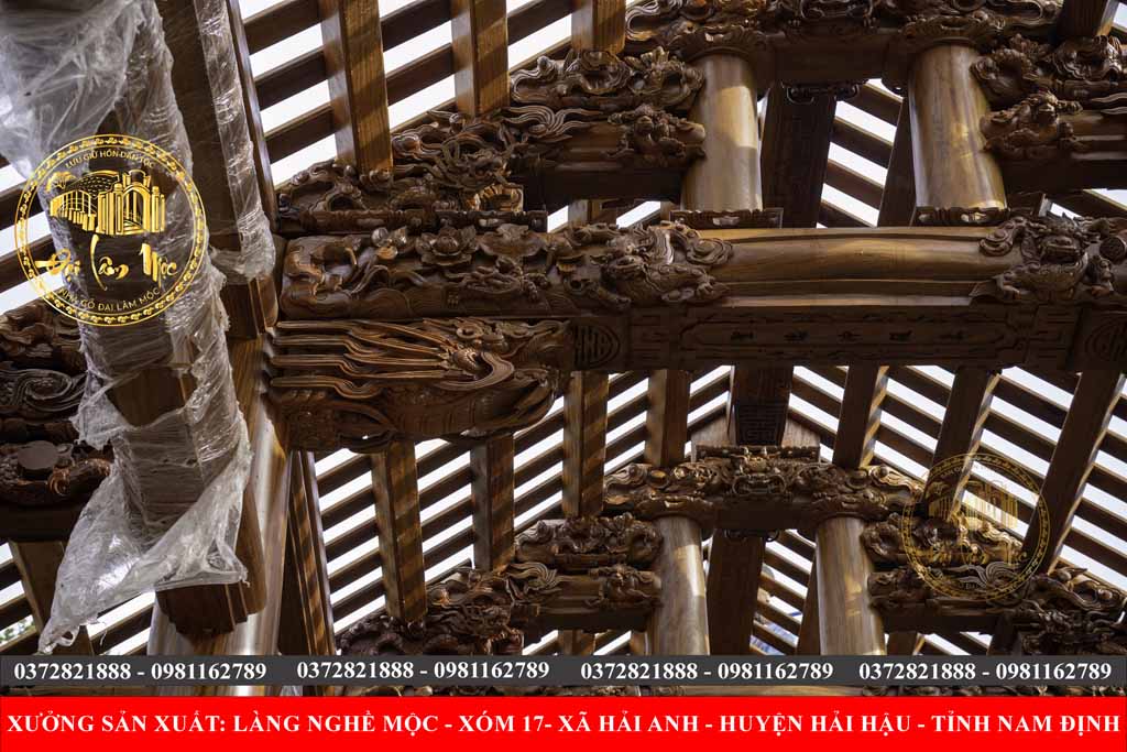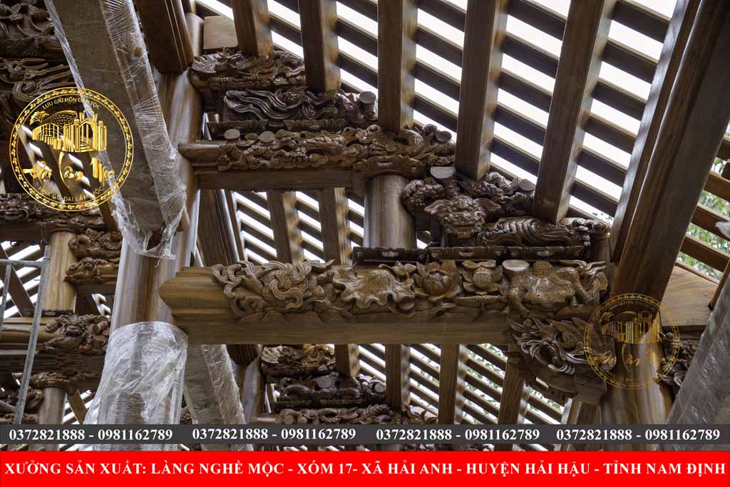 Mỗi cấu kiện gỗ đều được đục chạm thủ công tỉ mỉ, từ xà, kẻ, bẩy, cột đến mộng liên kết, đảm bảo yếu tố phong thủy và nghệ thuật.