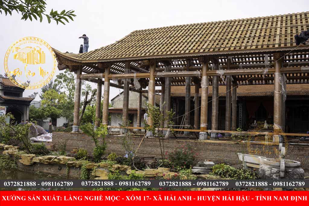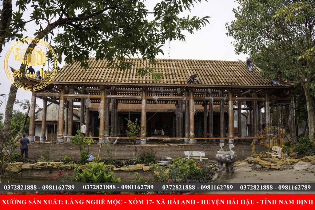 Ẩn chứa sau mỗi công trình nhà gỗ cổ truyền không chỉ là chất liệu gỗ quý, là những thớ vân mịn màng hay mái đao uy nghiêm – mà còn là cả một hành trình thi công cầu kỳ, tinh xảo và mang tính tâm linh sâu sắc. Tiêu biểu trong số đó là công trình nhà gỗ 5 gian mái đao thuộc đền Thánh Hoàng Bơ Thoải Cung, được Đại Lâm Mộc vinh dự thiết kế và thi công.