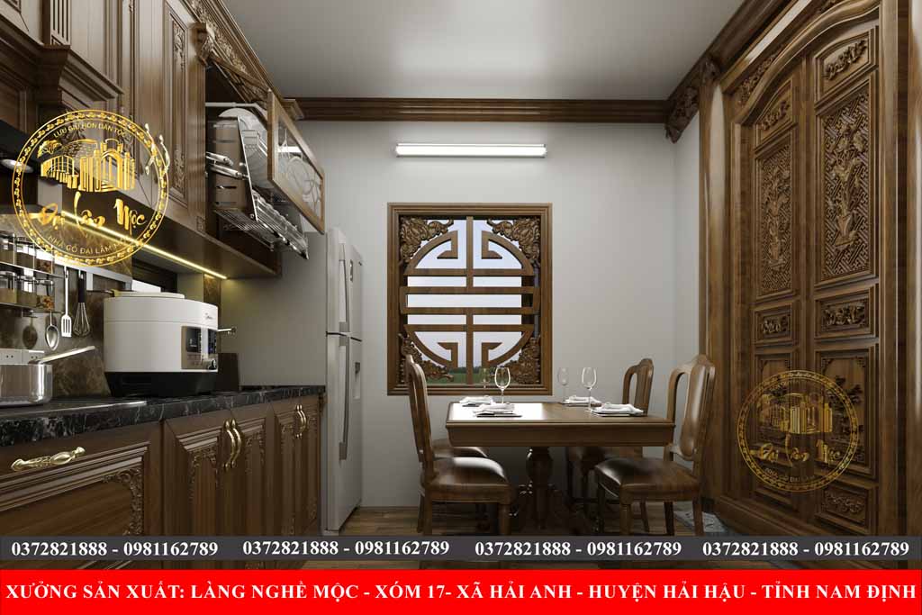 ✨ Kết hợp nội thất hiện đại như: sập gụ, tủ chè, bàn ăn nguyên khối, tủ rượu, hệ thống chiếu sáng thông minh