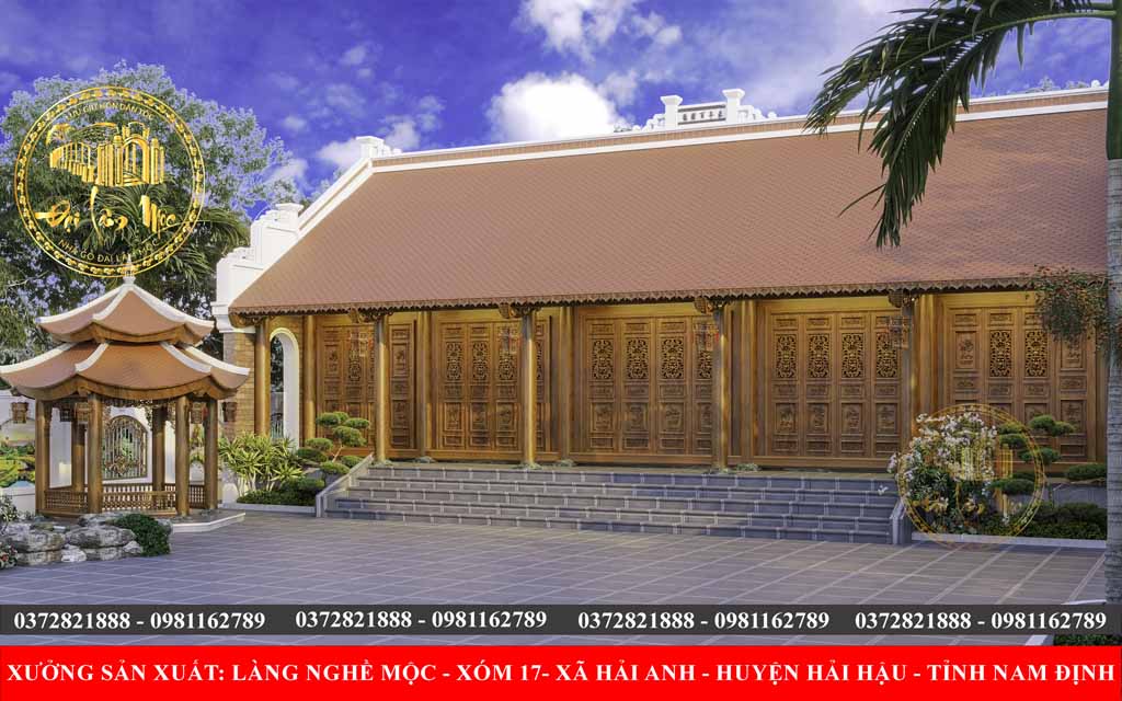 Nhà gỗ 5 gian 2 mái là biểu tượng của kiến trúc cổ truyền Bắc Bộ, nơi lưu giữ tinh hoa văn hóa Việt qua từng chi tiết chạm khắc, từng mạch gỗ thâm trầm. Công trình được thiết kế và thi công bởi Nhà Gỗ Đại Lâm Mộc, với sự kết hợp hài hòa giữa giá trị truyền thống và tiện nghi hiện đại.