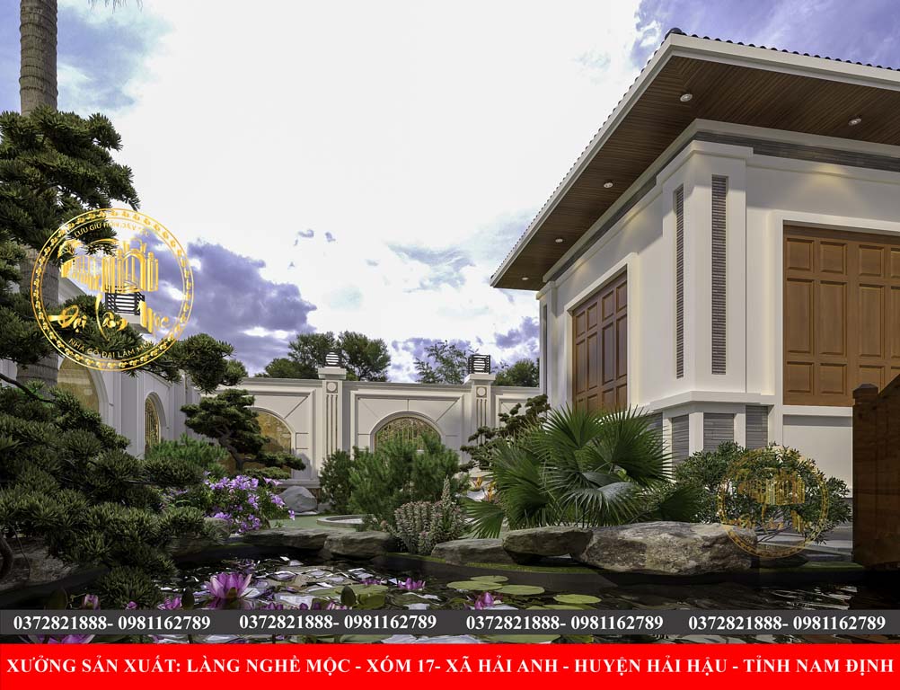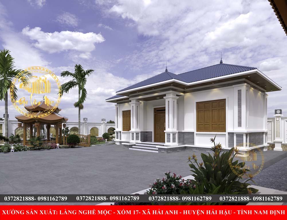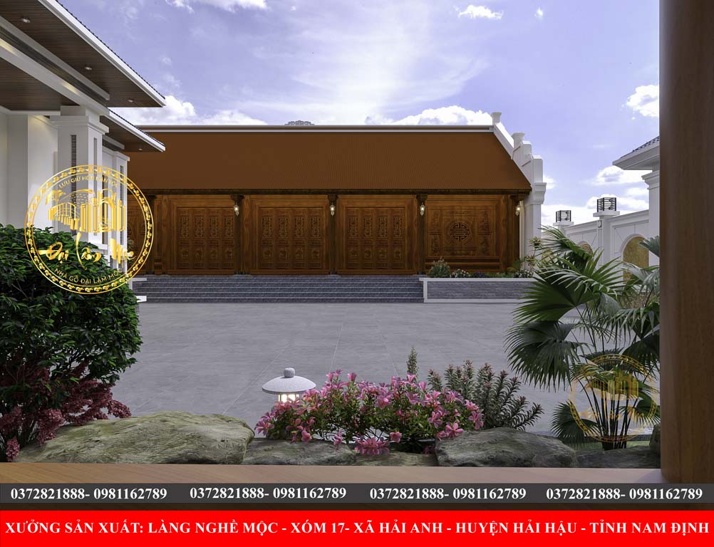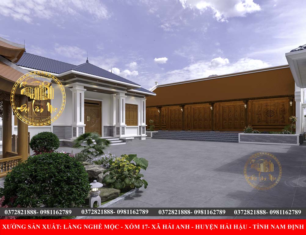 Bệ và Sân Lát Đá: Nền cao ráo với bậc tam cấp lát đá, tạo sự trang trọng và phân định rõ ràng với không gian sân vườn.
