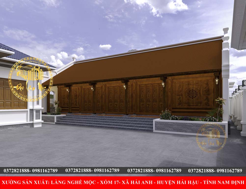 Vách và Cửa Gỗ Chạm Khắc: Toàn bộ mặt tiền sử dụng gỗ tự nhiên với các chi tiết chạm khắc tinh xảo, thể hiện sự kỳ công và tôn kính. Hình ảnh chữ Hỷ hoặc Phúc tròn là điểm nhấn mang ý nghĩa may mắn, tốt lành.